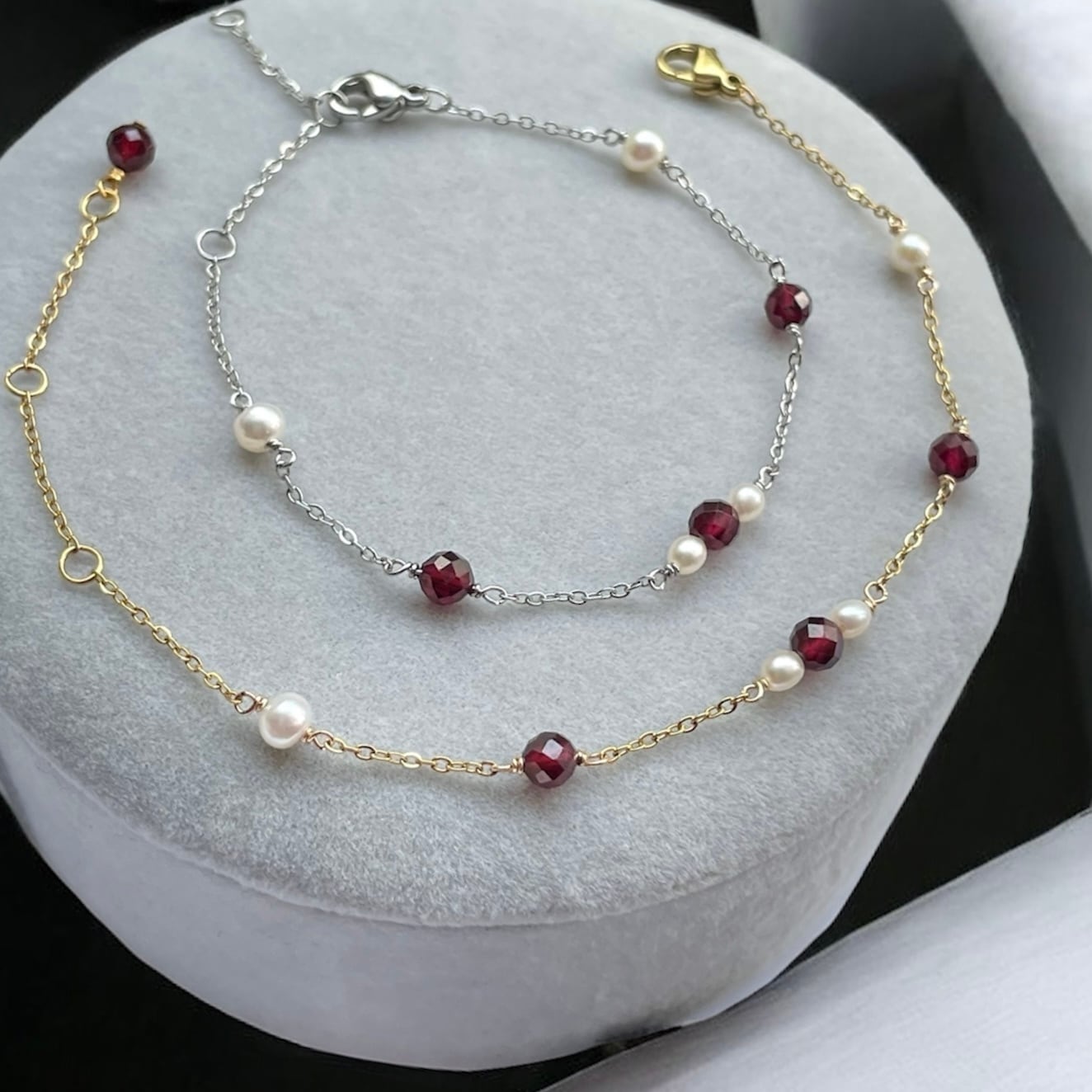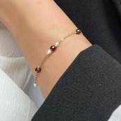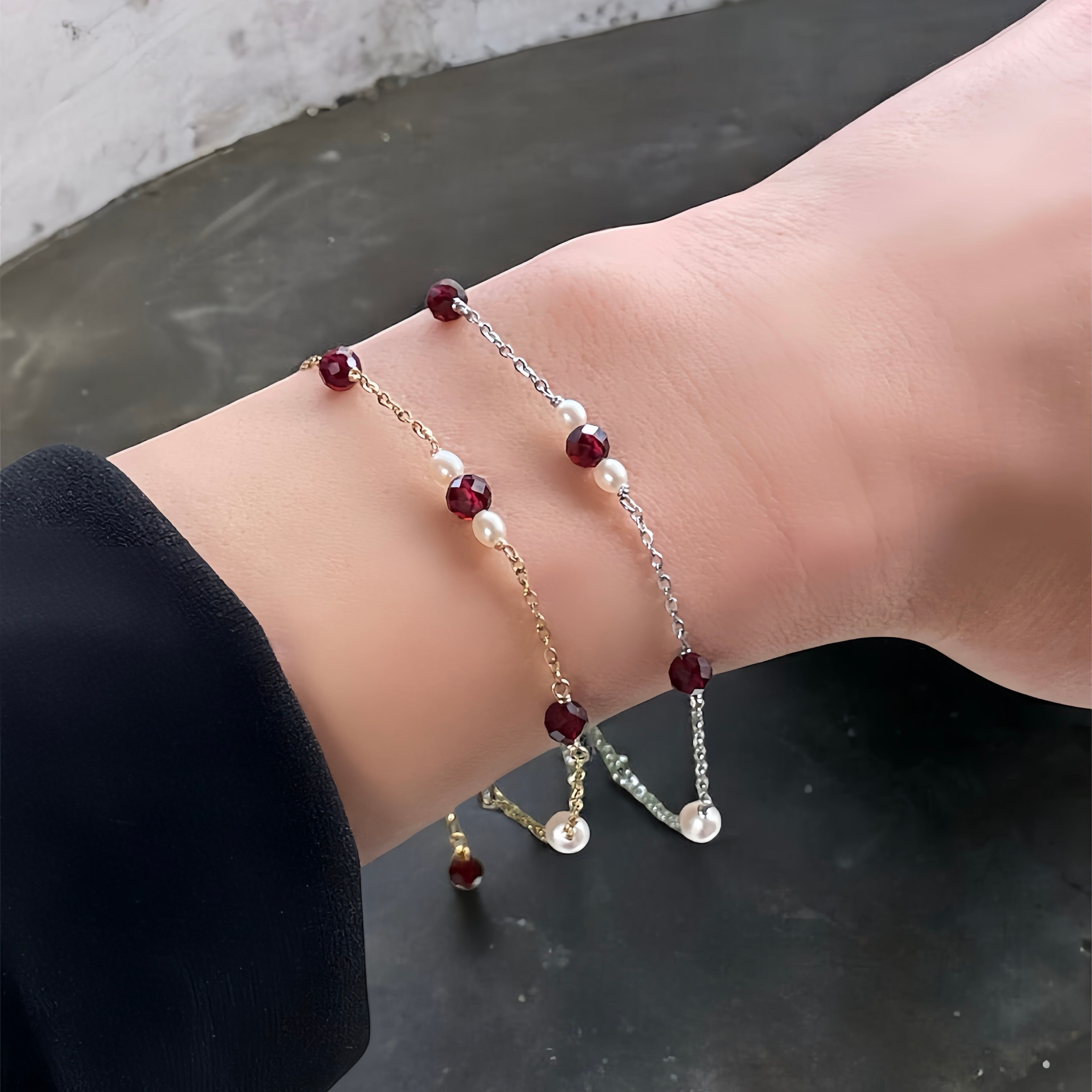 大人の誕生石アクセサリー◇ガーネット+淡水パール 華奢 ステーション チェーン ブレスレット◇金属アレルギー対応/誕生石/サージカルステンレス