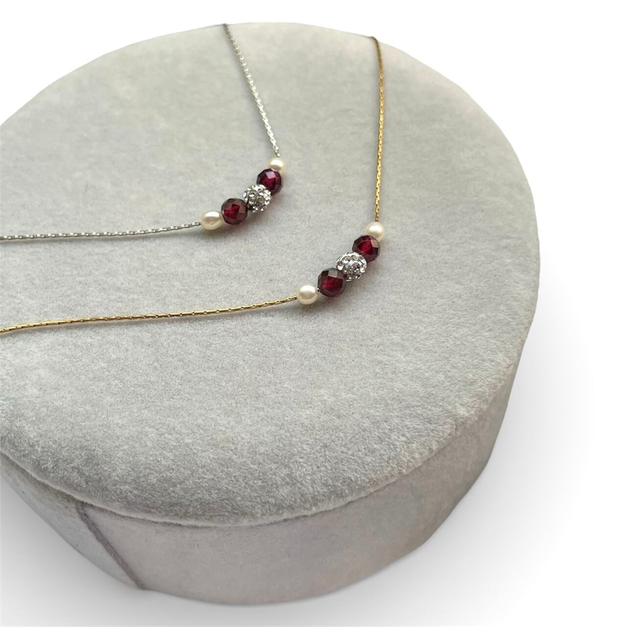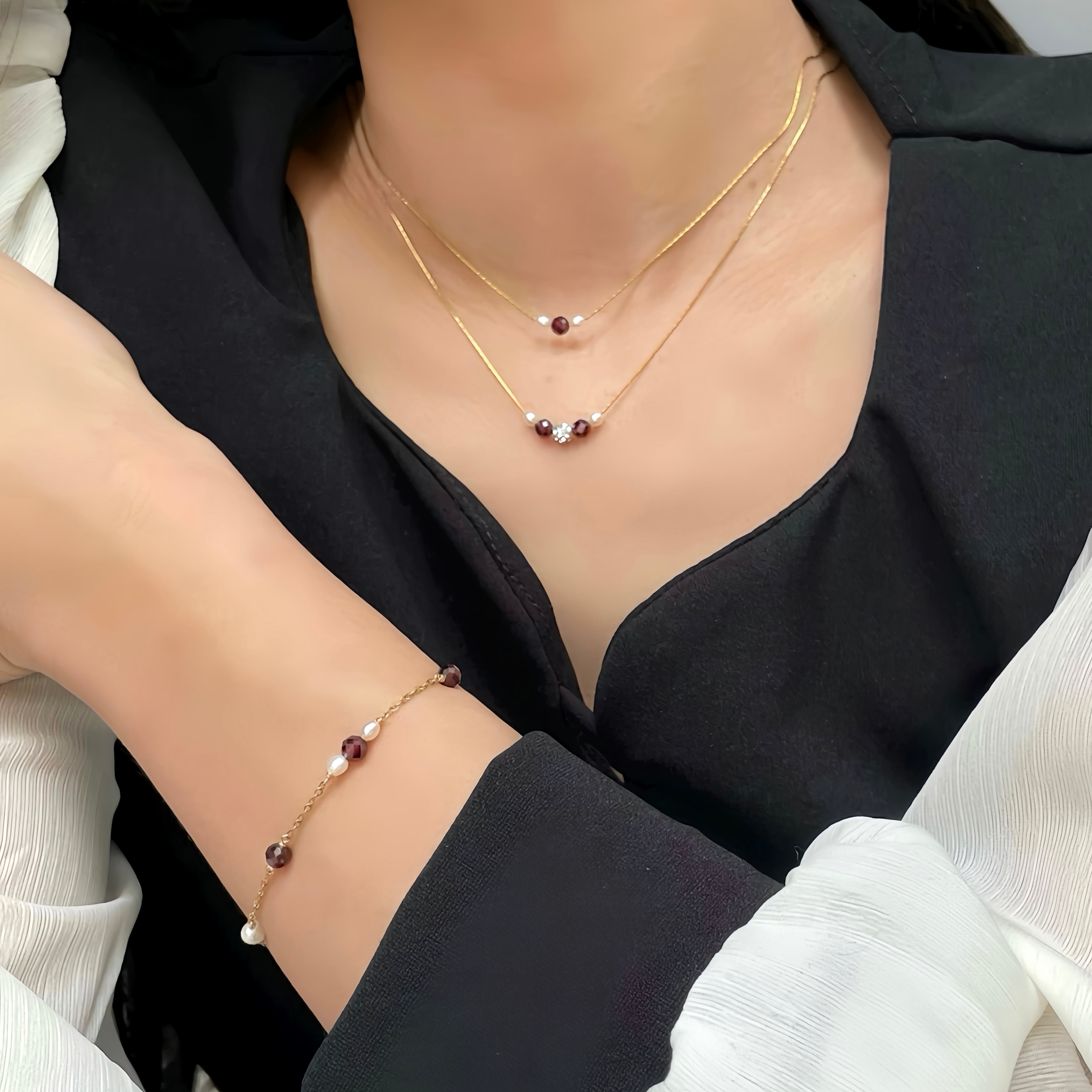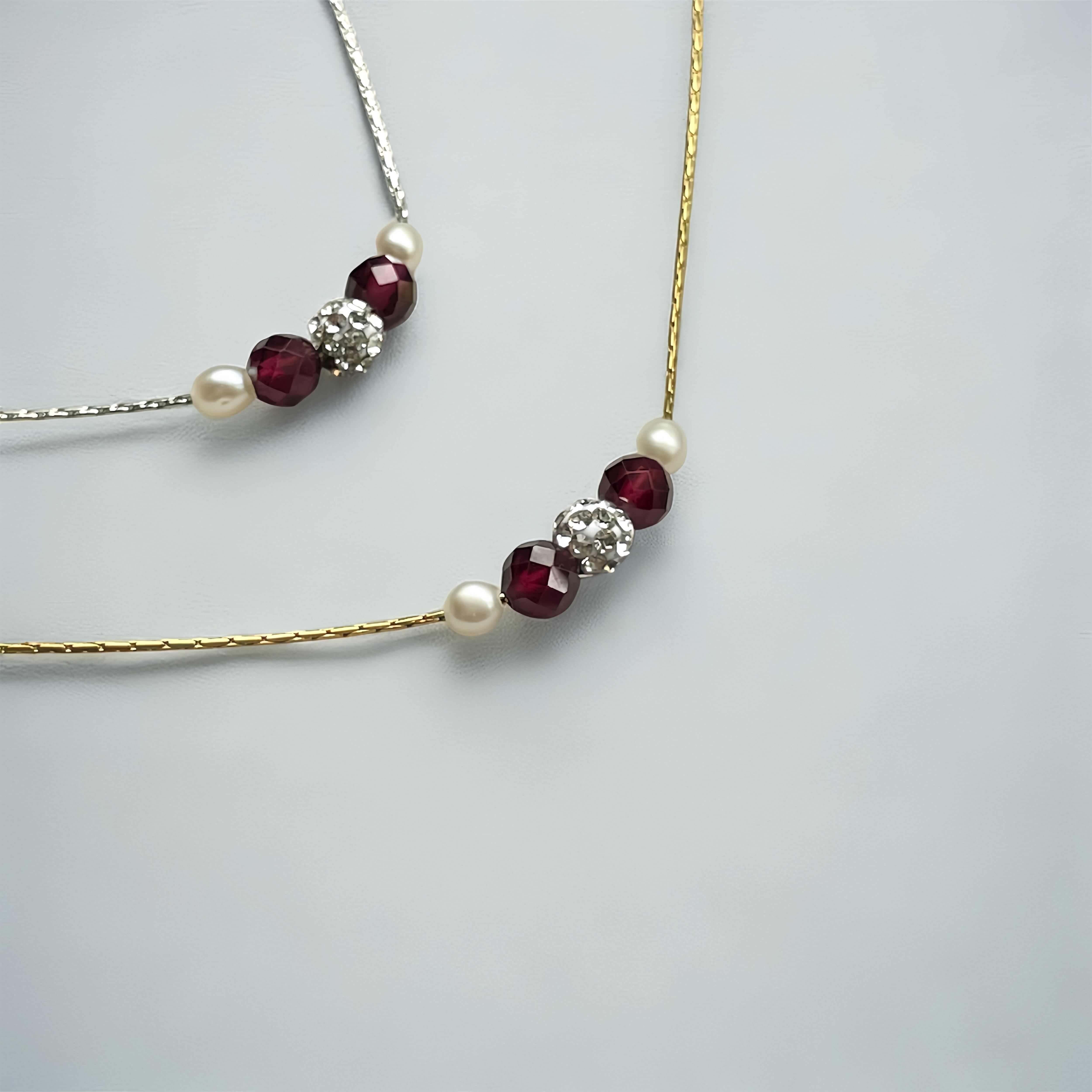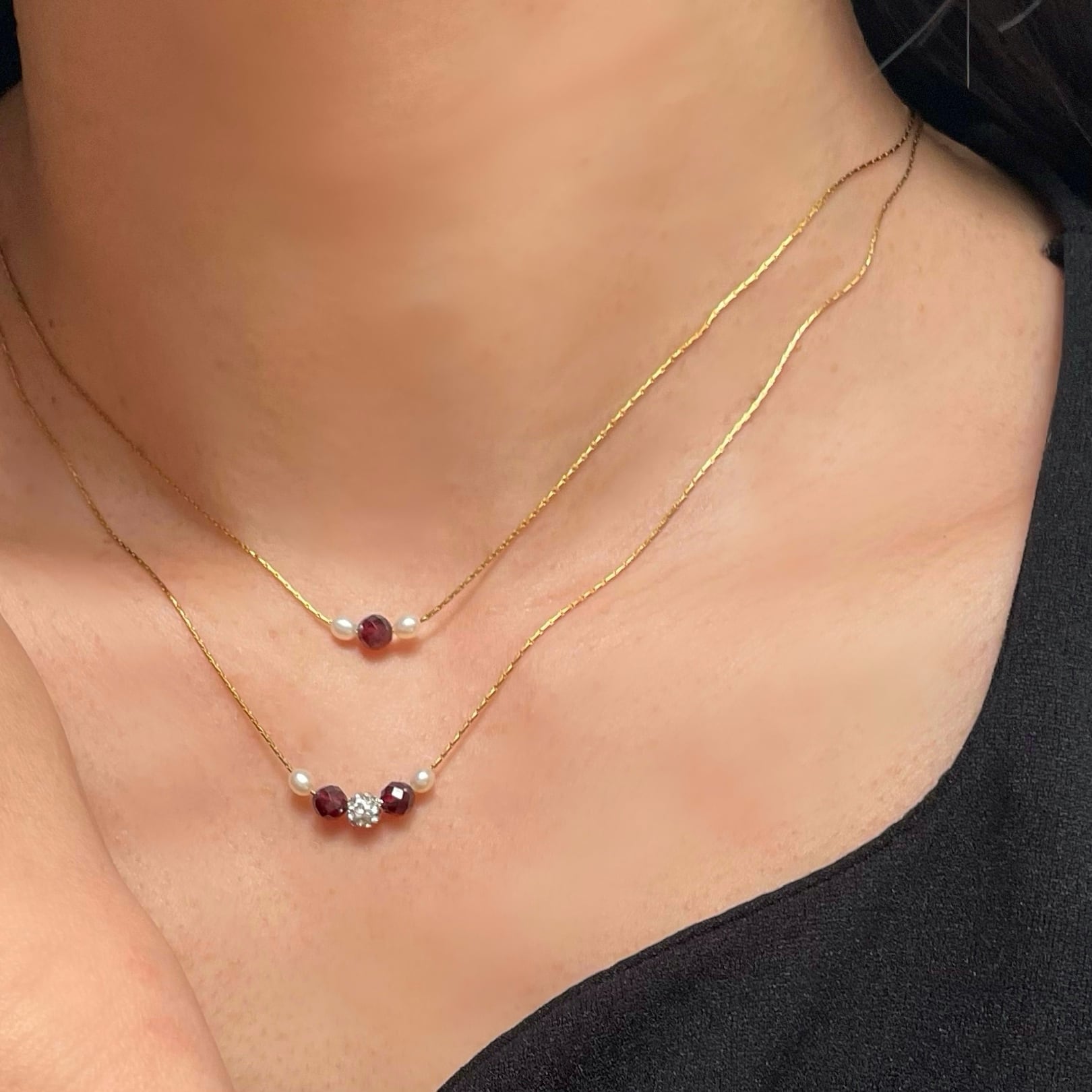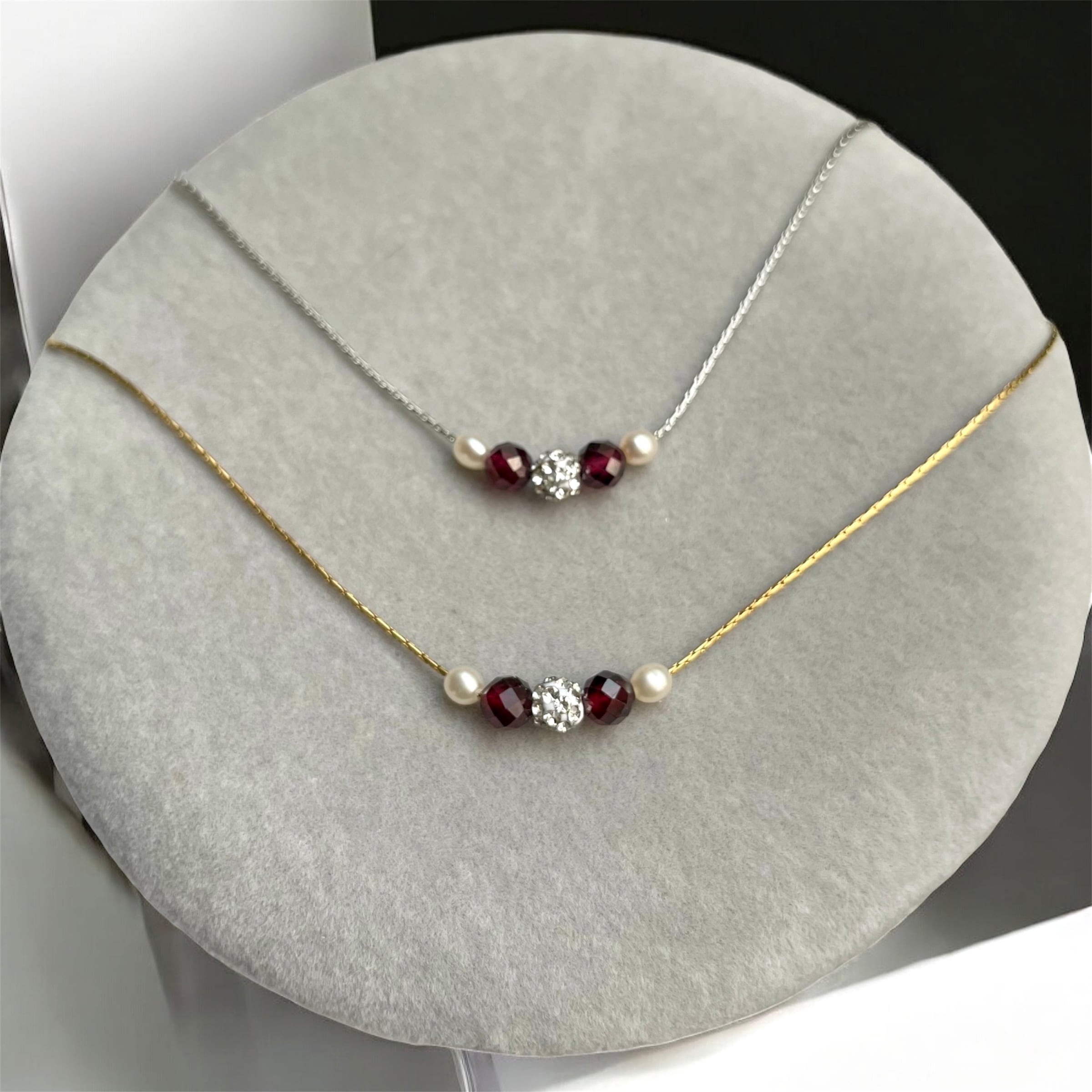 大人の 誕生石 アクセサリー◇ガーネット+淡水パール+CZ パヴェ ダイヤ 5粒 華奢 ネックレス◇金属アレルギー対応 サージカルステンレス