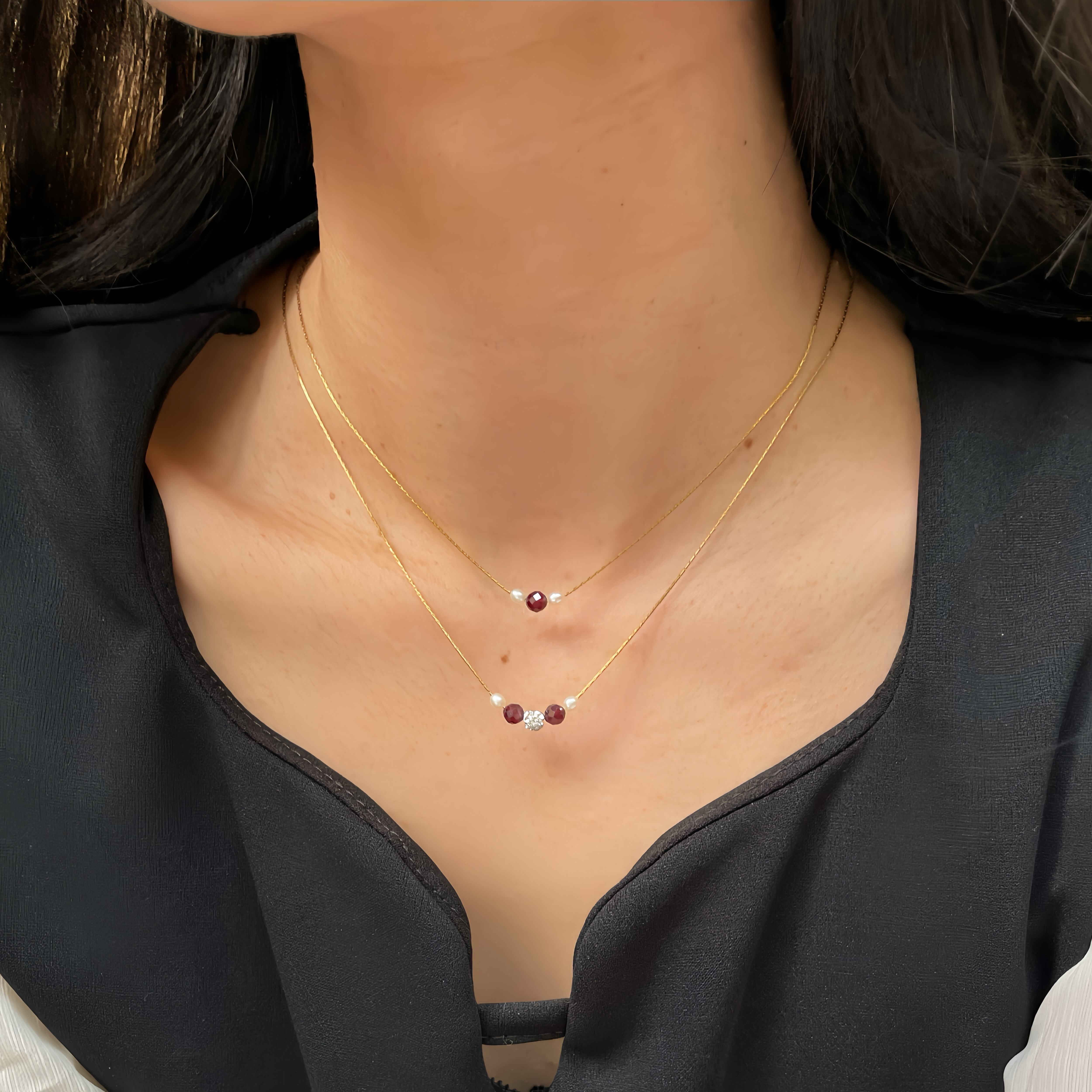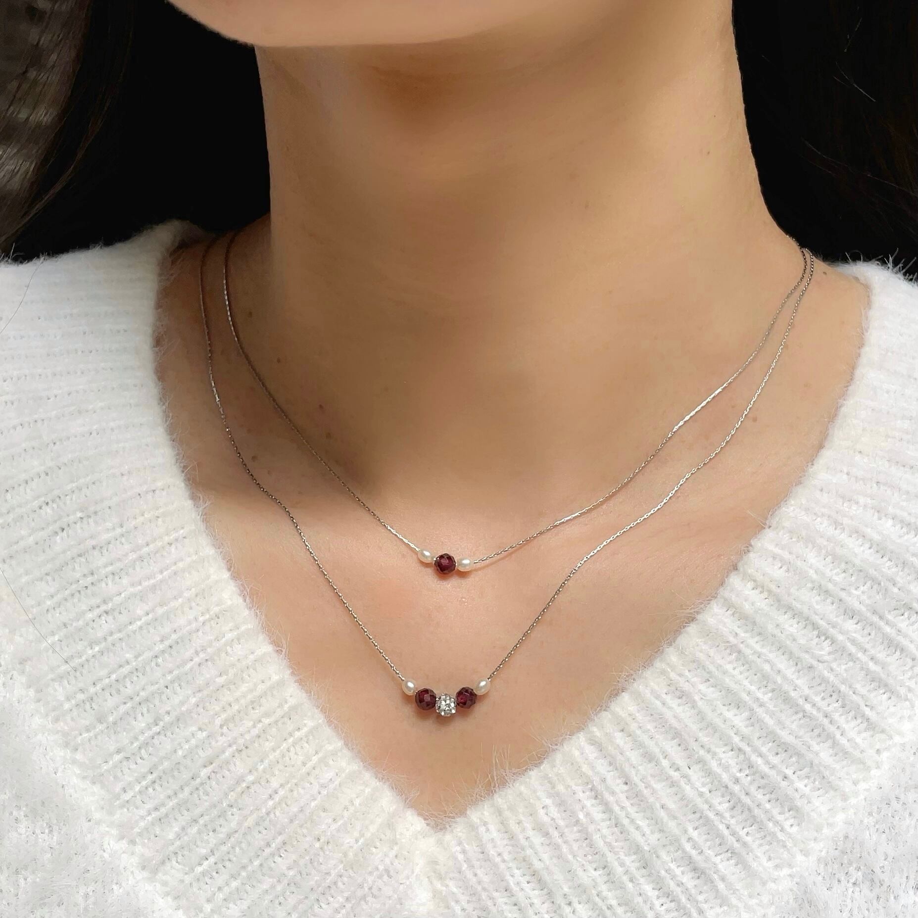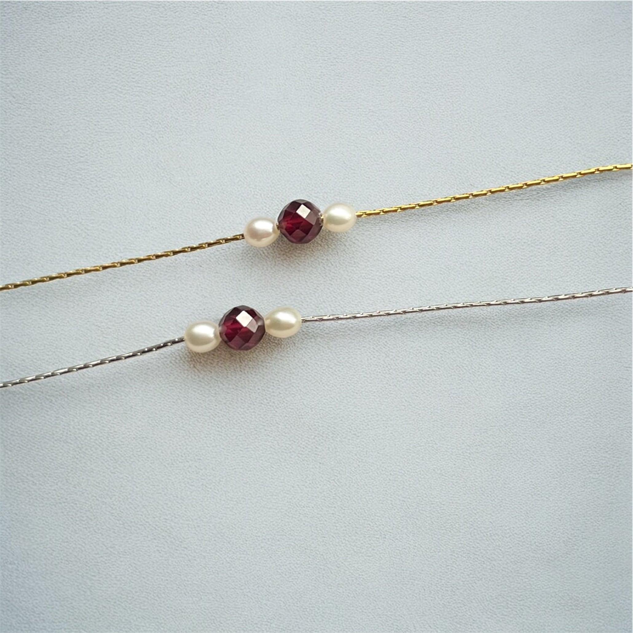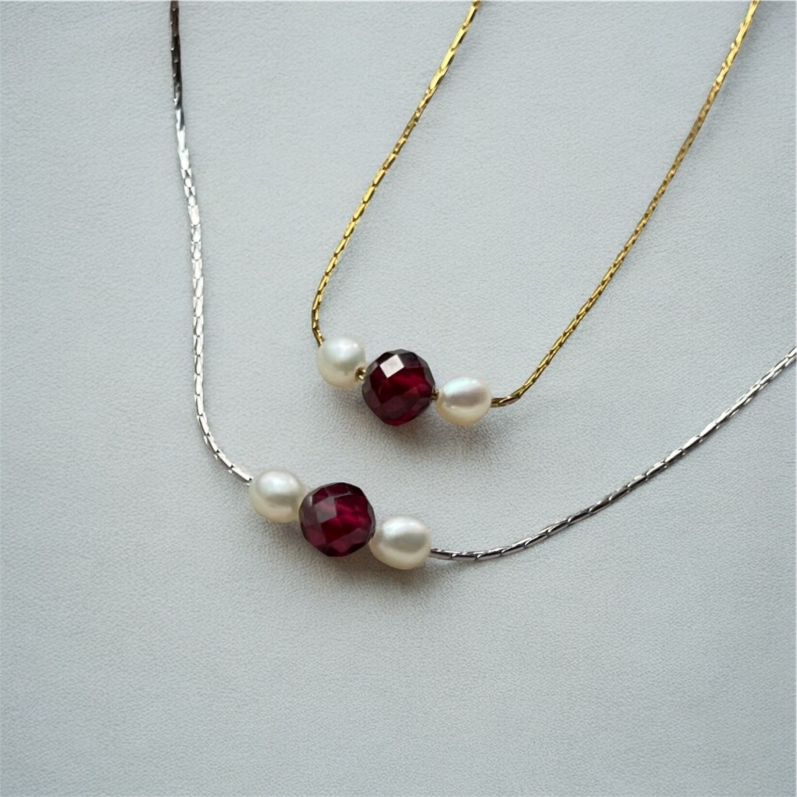 大人の 誕生石 アクセサリー◇ガーネット+ベビーパール 3粒 華奢 ネックレス◇金属アレルギー対応 サージカルステンレス