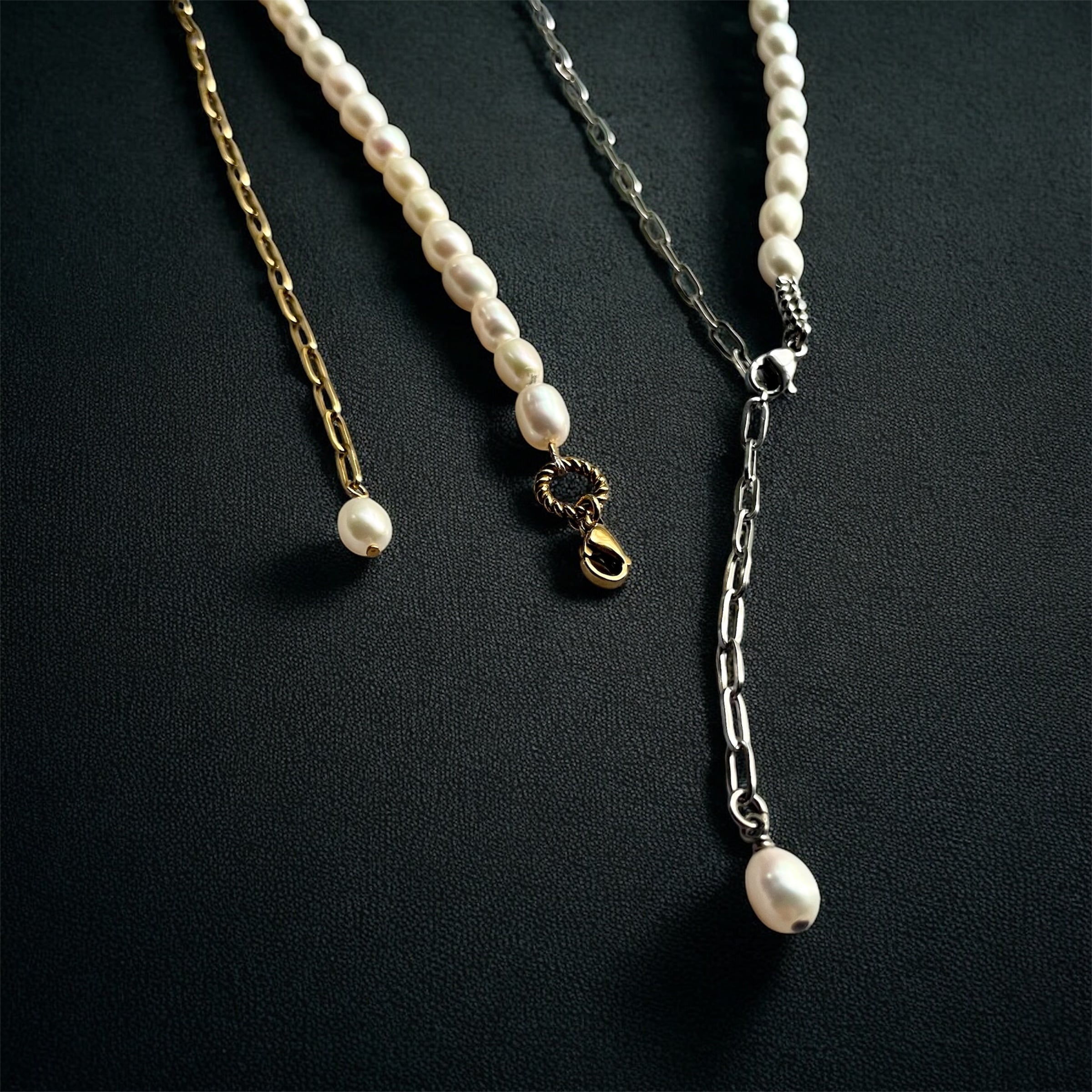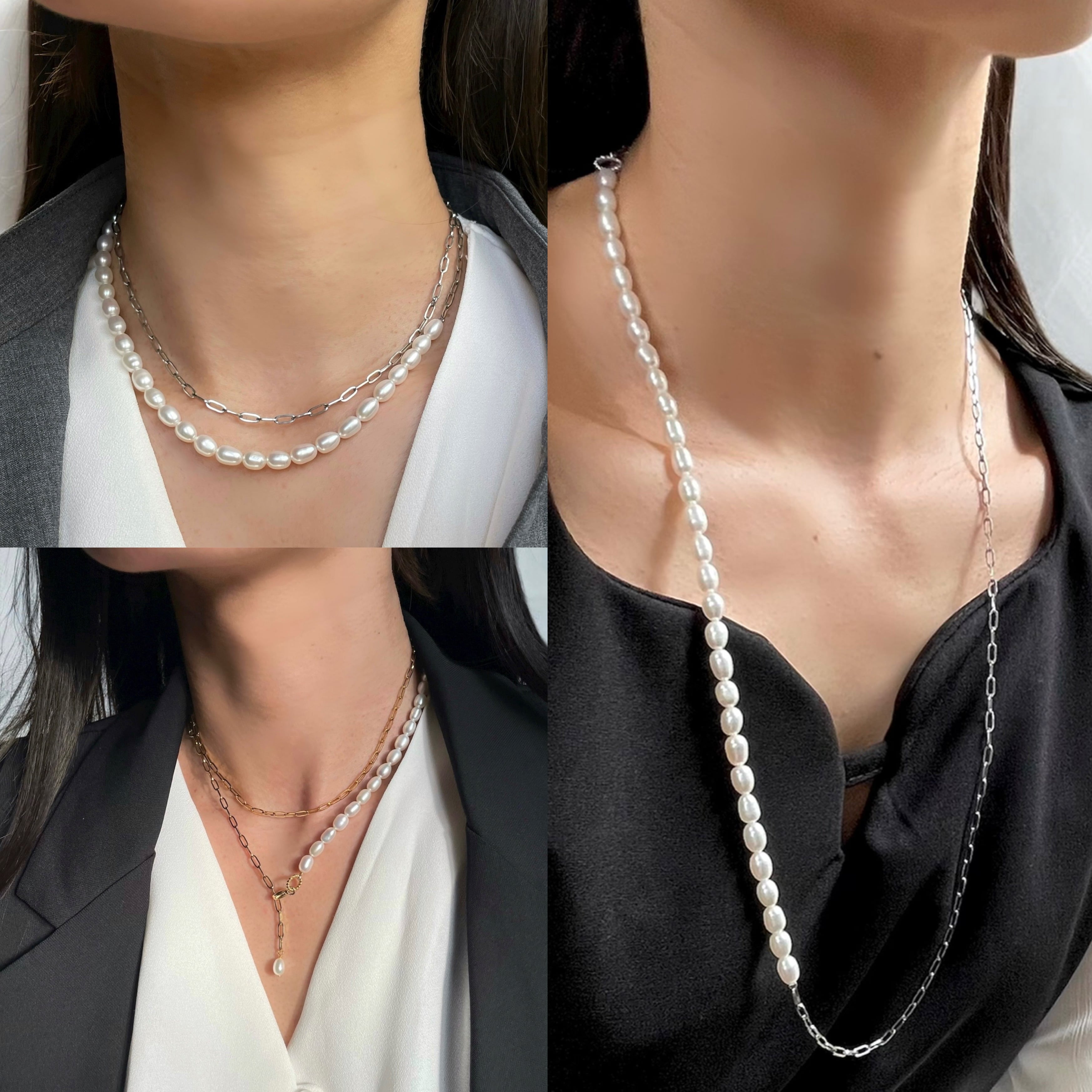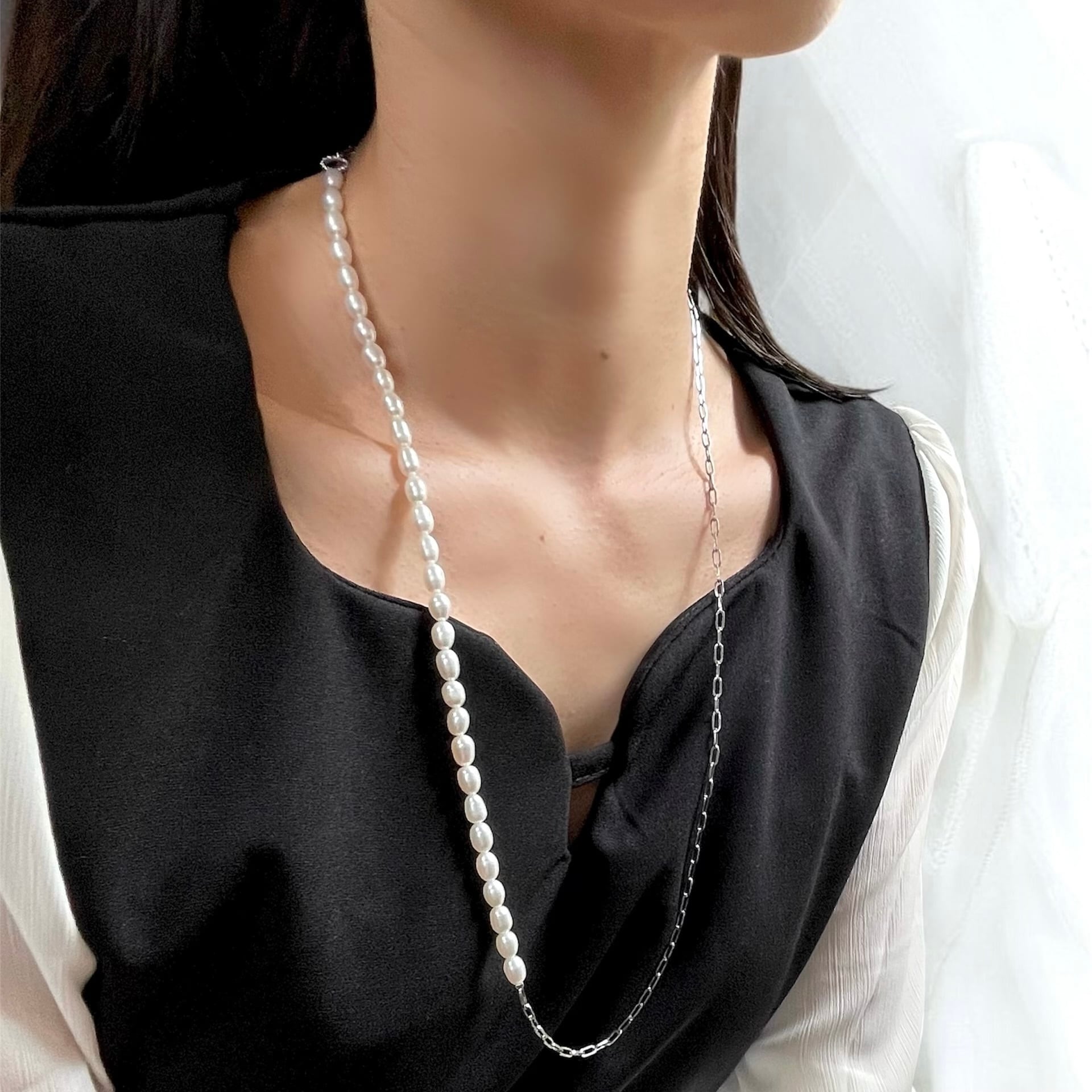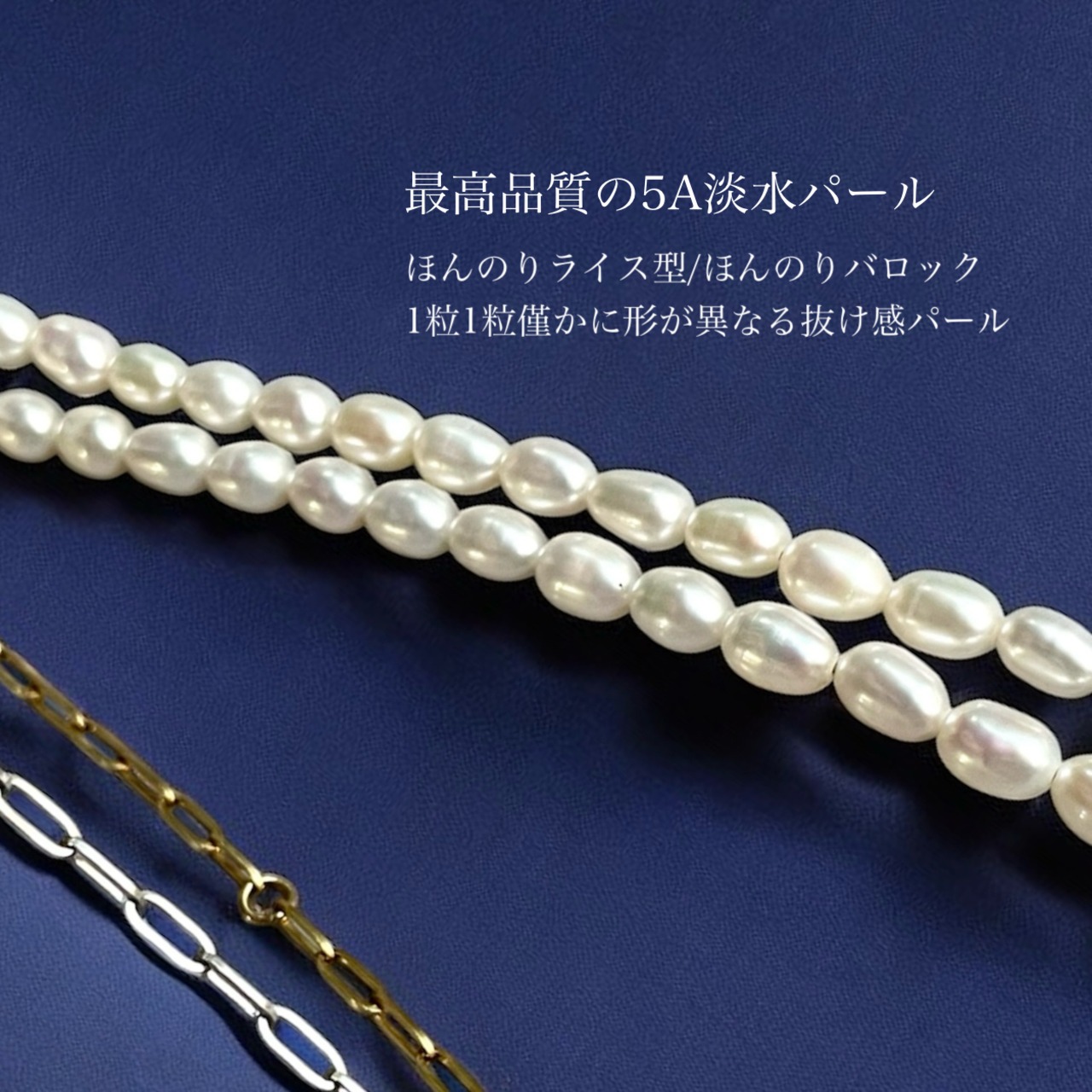 1粒1粒ほんの僅かに表情が異なるぷっくり淡水パール×スタイリッシュなオーバルチェーンの【アシンメトリー】