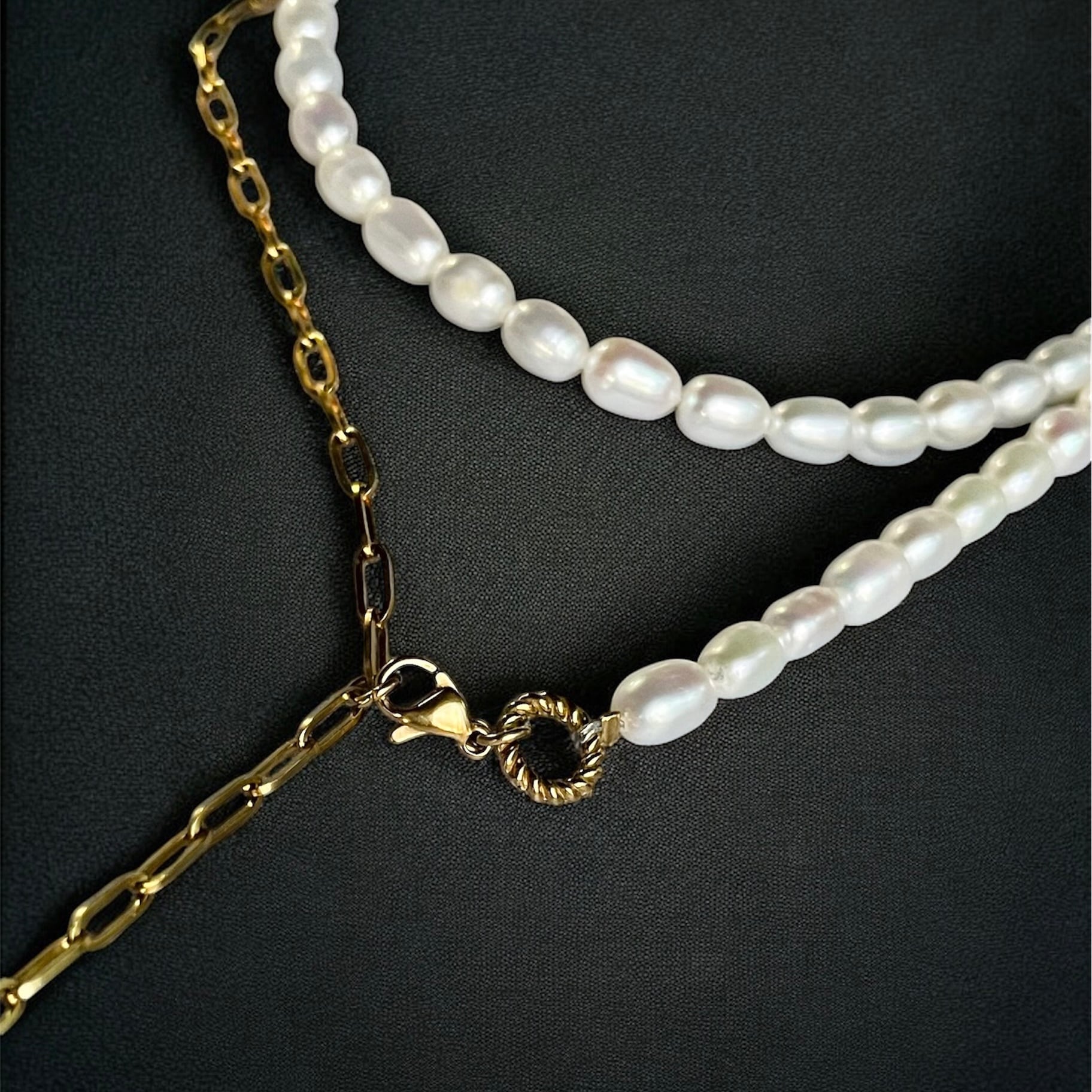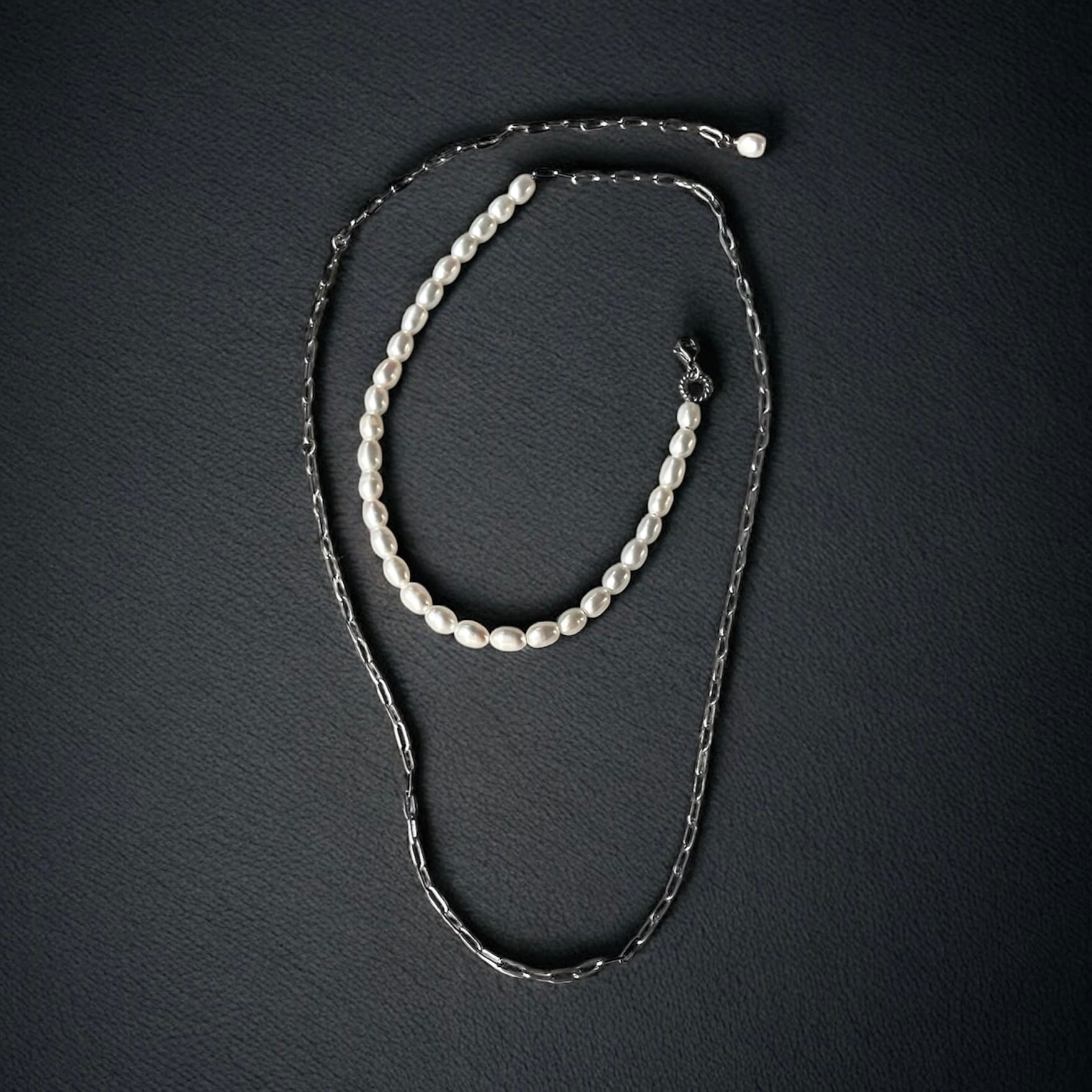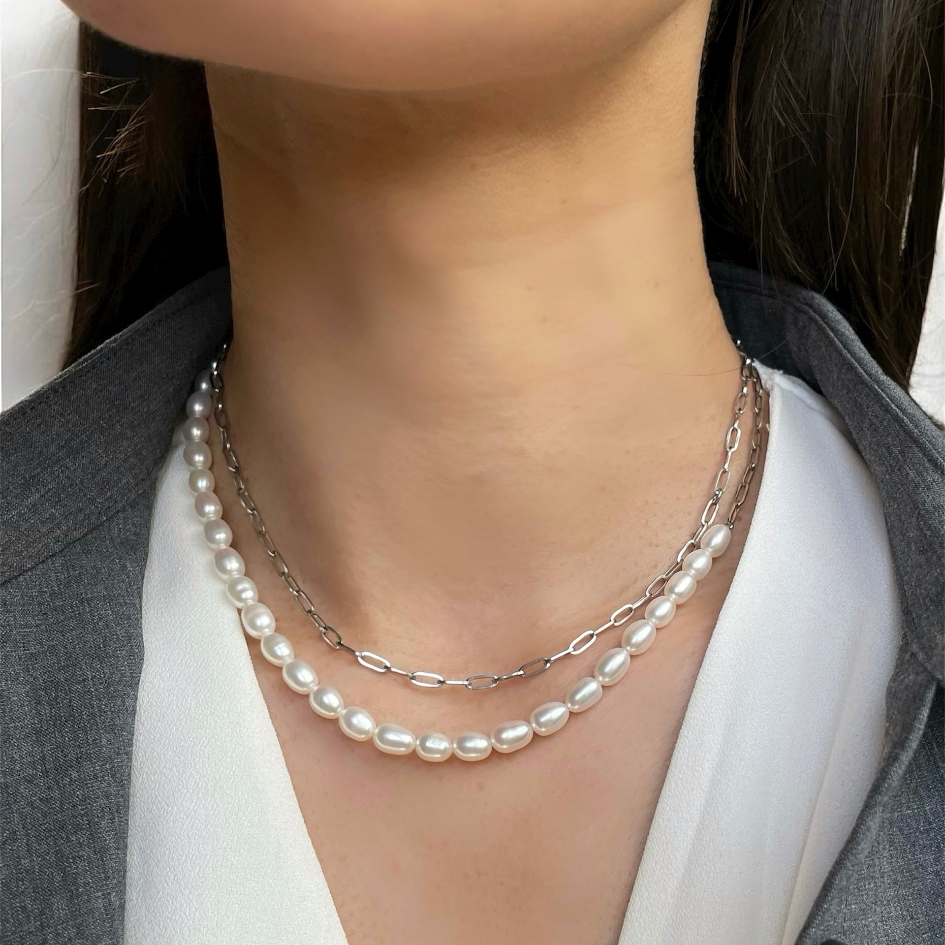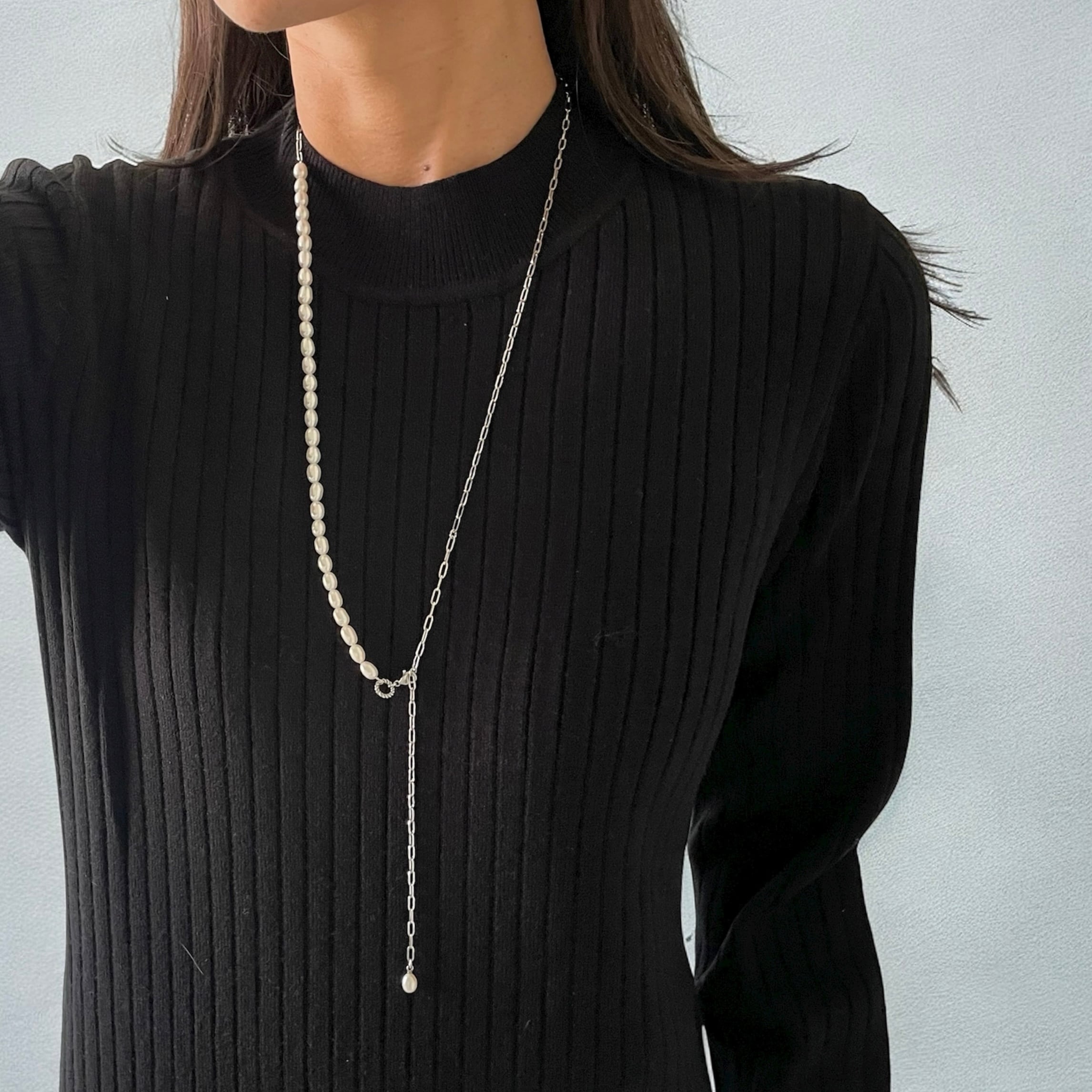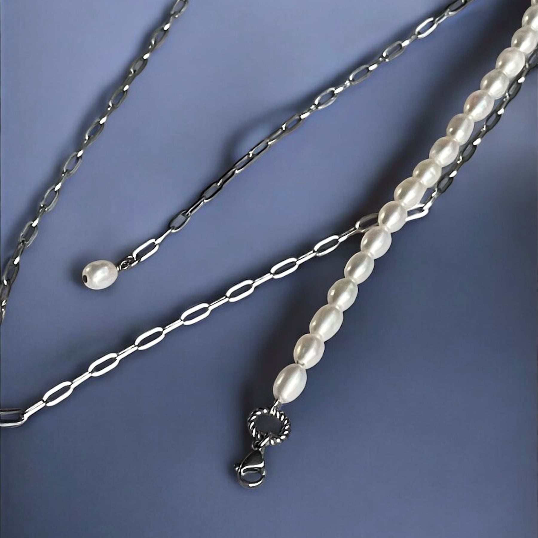 1粒1粒ほんの僅かに表情が異なるぷっくり淡水パール×スタイリッシュなオーバルチェーンの【アシンメトリー】